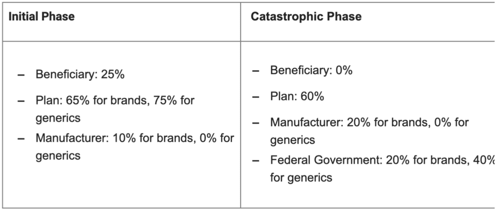 - Beginning in 2024, beneficiaries will be responsible for $0 in the catastrophic benefit phase. There are no changes to the initial coverage phase or coverage gap phase.